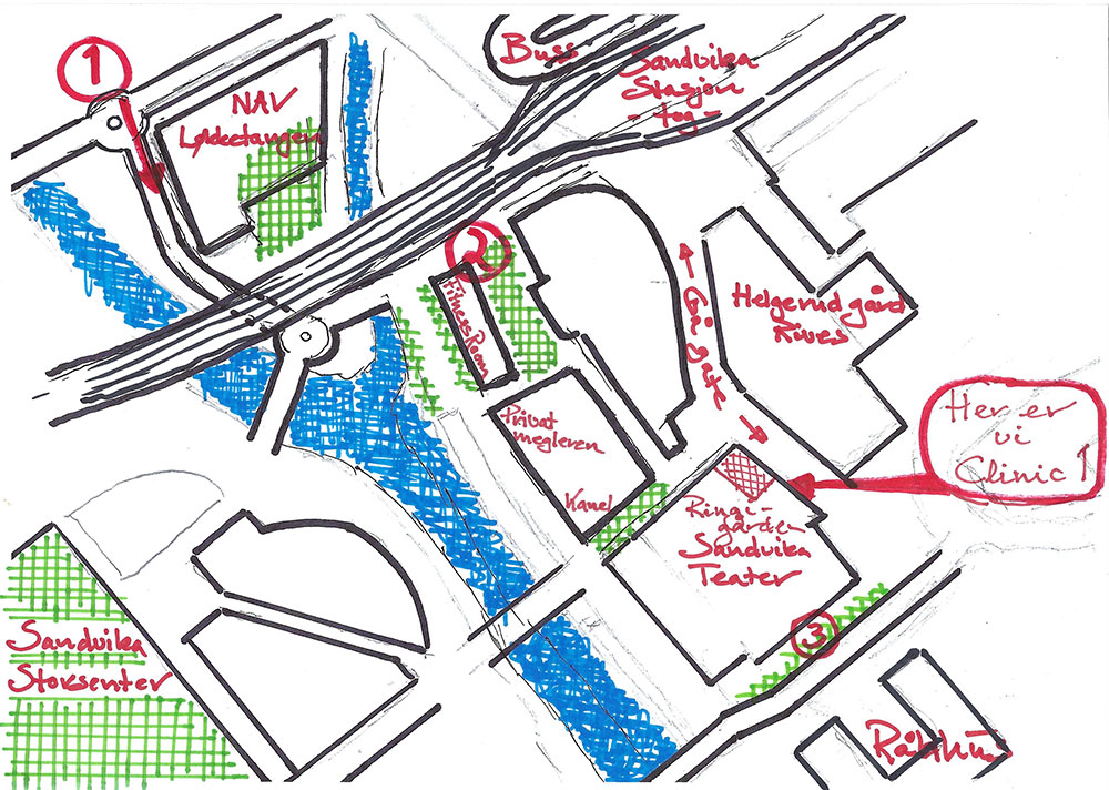 - Det er enklest for deg å parkere på Sandvika Storsenter. Herfra går du ned til elven og over broen, og rett opp Kinoveien til klinikken med inngang ovenfor Frisør/Sandvika Teater.